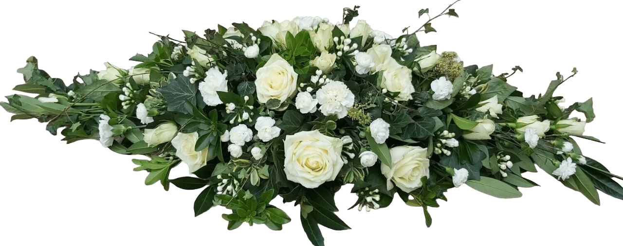 Тази изчистена и елегантна композиция е съставена основно от бели цветя, с леки зелени акценти. Бялото доминира, предавайки усещане за спокойствие и почит. Зеленият акцент добавя нотка на свежест и символизира вечността. Този букет е перфектен за по-сериозни и традиционни церемонии. Такива цветя за некролог са идеални за предаване на съобщение за мир и вечен покой.