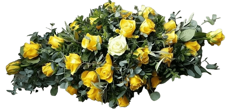Смесените цветя в жълти и зелени нюанси създават свежа и естествена визия. Жълтите рози носят усещане за радост и топлина, докато зелените листа символизират живота и природата. Тази аранжировка е подходяща за изразяване на почит и уважение по уникален начин. Тези цветя за некролог са чудесен избор за тези, които искат да подчертаят връзката с природата.